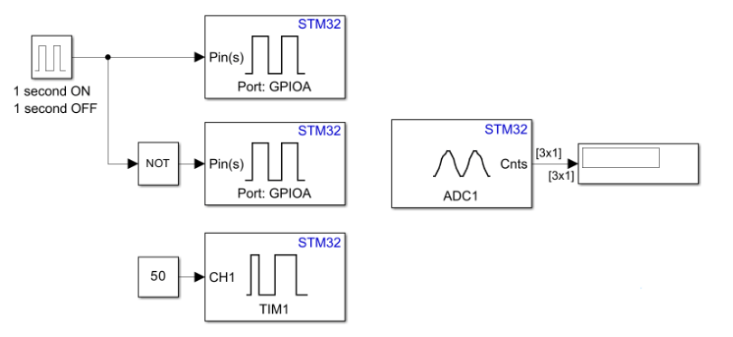 This example shows how to use Connected IO in Embedded Coder® Support Package for STMicroelectronics® STM32 Processor. It illustrates how to progressively add blocks and use Connected IO to read and write values to and from target hardware.