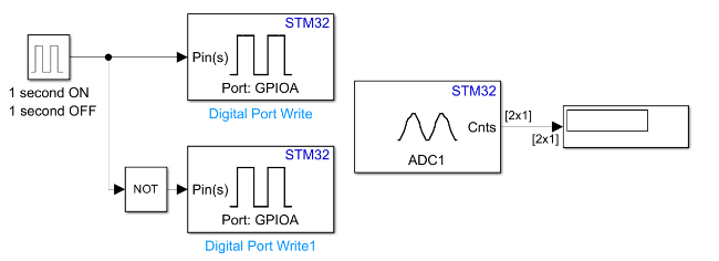 Connect the other ADC channel to the PWM output channel. For information on using ADC channels see Using the Analog to Digital Converter Block to Support STMicroelectronics STM32 Processor Based Boards. For information on using PWM outputs, see PWM Output.