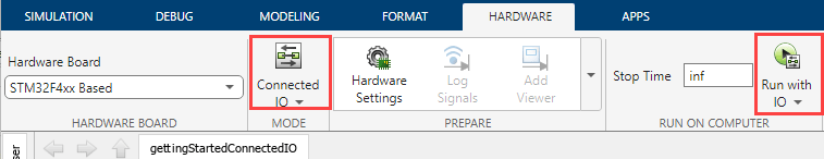 On the Hardware tab of the Simulink model, in the Mode section, select Connected IO.