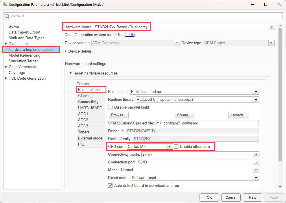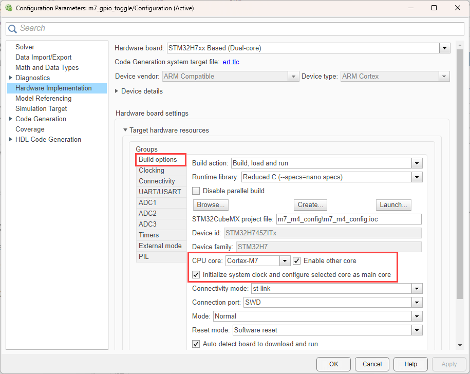 Configure Simulink model using both cores together (Cortex-M7 as primary core and Cortex-M4 as the secondary core).