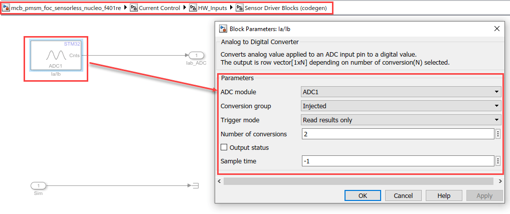 Double-click the blocks to open the block parameter configurations. Ensure the specified parameter values are the same if you want to run this example on a different hardware board.