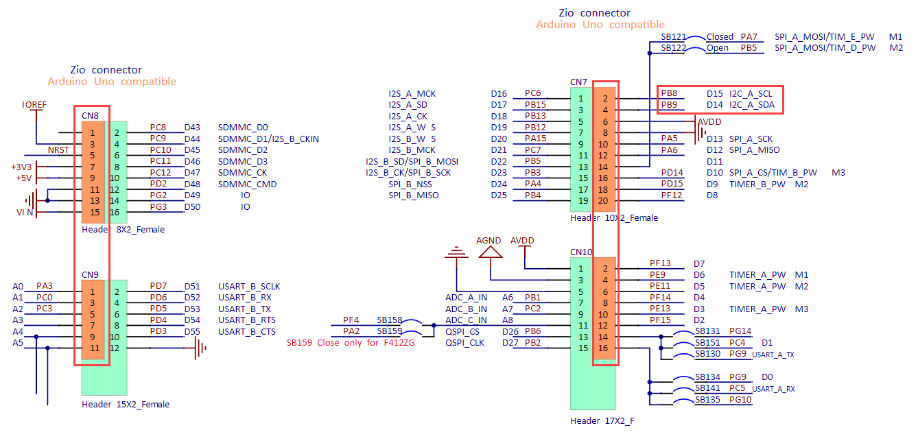 I2C data line (SDA) gets connected to PB9 (D14)