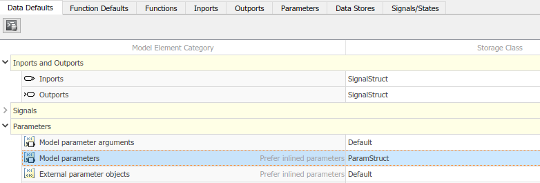 5. In the Embedded Coder app, open the Code Mappings editor. On the Data Defaults tab, map these model element categories: