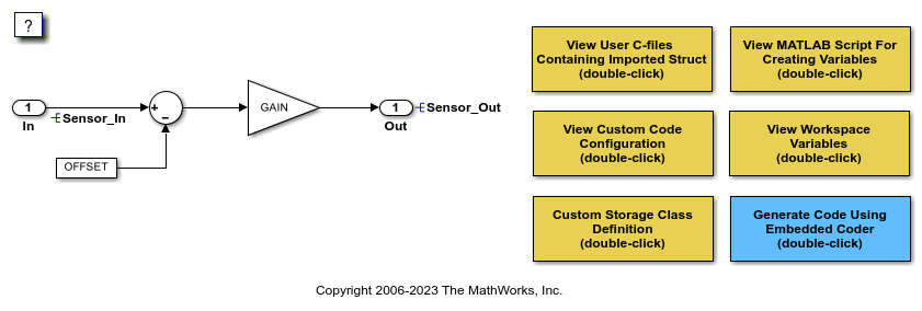 The model creates variables and objects in the base workspace. The Constant block and the Gain block use the ECoderDemos.Parameter objects GAIN and OFFSET to set the Constant value and Gain block parameters. ECoderDemos is an example custom package that defines two classes, Parameter and Signal, and some custom storage classes.