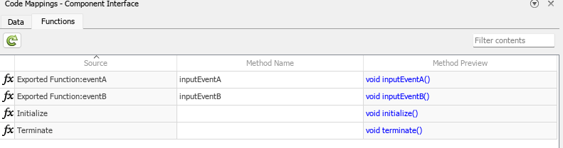 The model class also encapsulates entry-point methods in the generated code. You can specify the names of entry-point methods by using the Code Mapping editor. Method name mappings are located under the Functions tab.