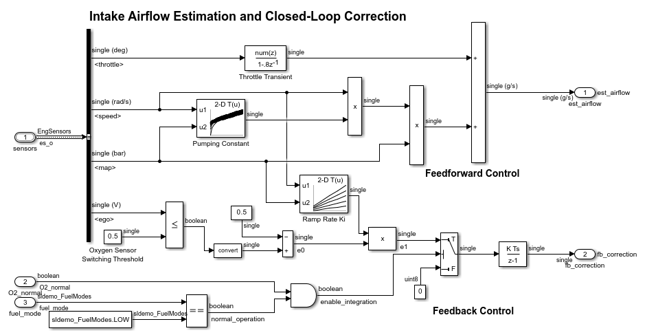 This controller model contains two models, airflow_calc and fuel_calc. The two output signals of airflow_calc, est_airflow and fb_correction, are inputs of fuel_calc.