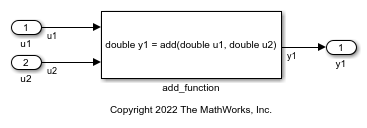 function y1 = add_function(u1, u2) % Set the class and size of output y1 = u1; % Call external C function y1 = coder.ceval('add',u1,u2); end