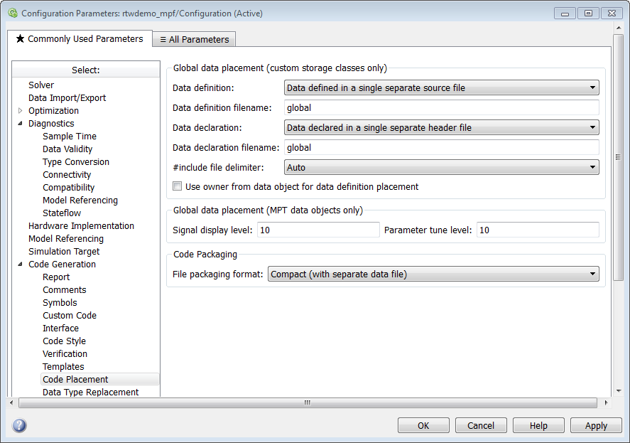 Both | The number you specify is relative to Signal display level or Parameter tune level on the Code Placement pane of the Configuration Parameters dialog box. For a signal, allows you to specify whether or not the code generator declares the data object as global data. For a parameter, allows you to specify whether or not the code generator declares the data object as tunable global data. See Signal display level and Parameter tune level in Model Configuration Parameters: Code Generation Code Placement. | ||
