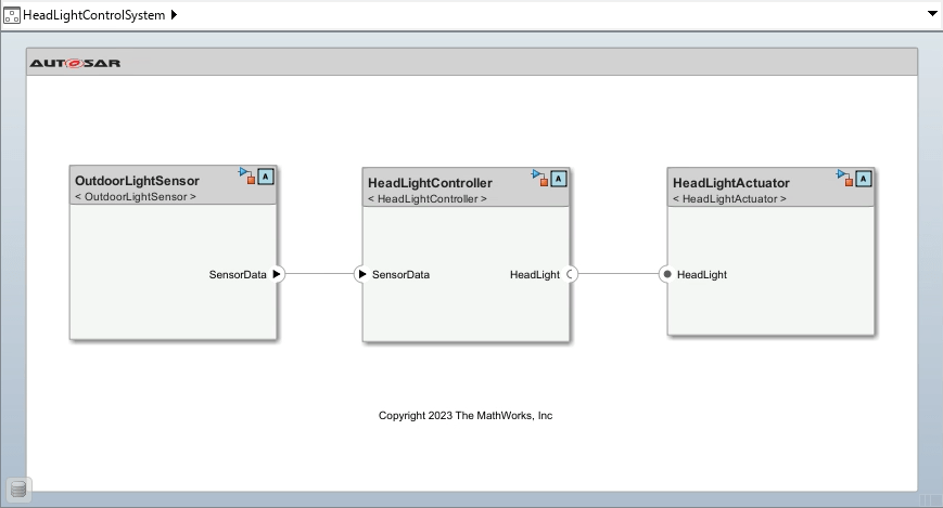 The architecture model used in this example has three components, OutdoorLightSensor, HeadLightController, and HeadLightActuator. OutdoorLightSensor processes the data received from sensor and sends the data to HeadLightController by using adaptive events. HeadLightController calls the method from HeadLightActuator to turn on or off the headlight using adaptive methods. HeadLightActuator turns the car head light on or off based on the input received from HeadLightController.