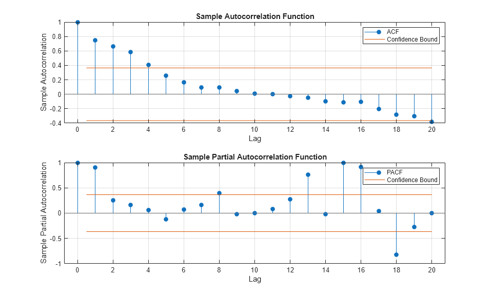 plot(Y); title('Simulated Time Series') xlabel('t') ylabel('Y') subplot(2,1,1) autocorr(Y) subplot(2,1,2) parcorr(Y)