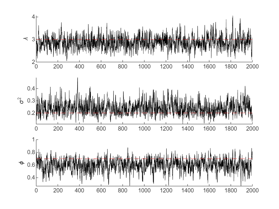 Figure contains 3 axes objects. Axes object 1 with ylabel \phi contains 2 objects of type line, constantline. Axes object 2 with ylabel \sigma^2 contains 2 objects of type line, constantline. Axes object 3 with ylabel \lambda contains 2 objects of type line, constantline.