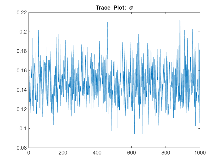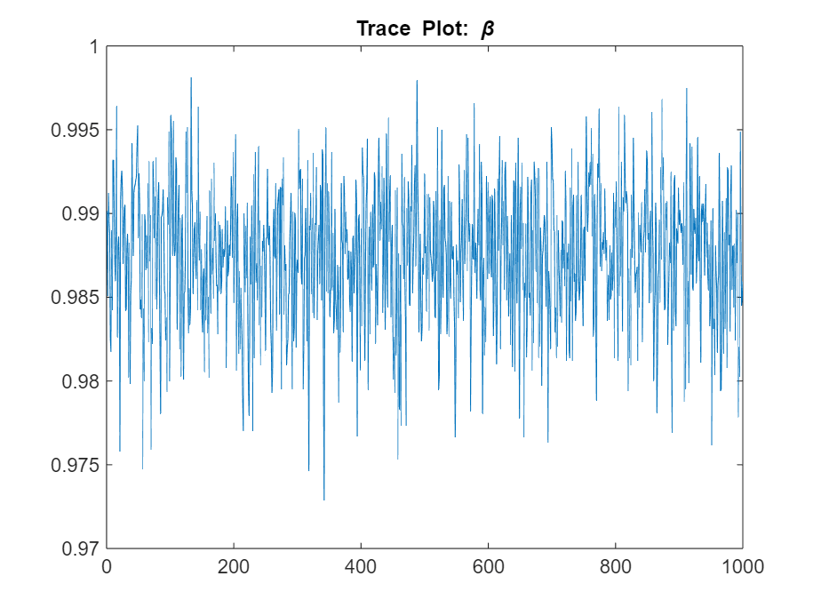 The sampler eventually settles at near the true values of the parameters. In this case, the sample shows serial correlation and transient behavior. You can remedy serial correlation in the sample by adjusting the Thin name-value argument, and you can remedy transient effects by increasing the burn-in period using the BurnIn name-value argument.