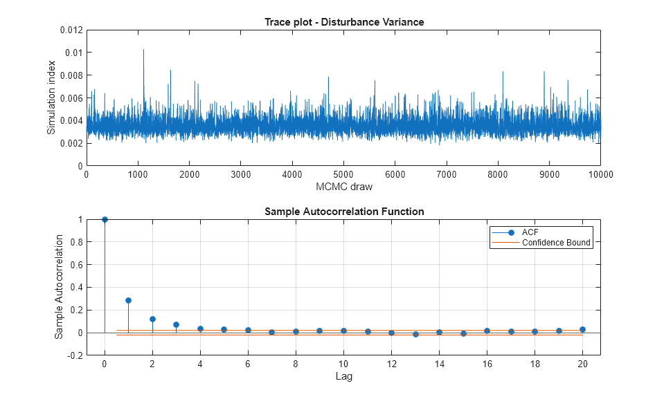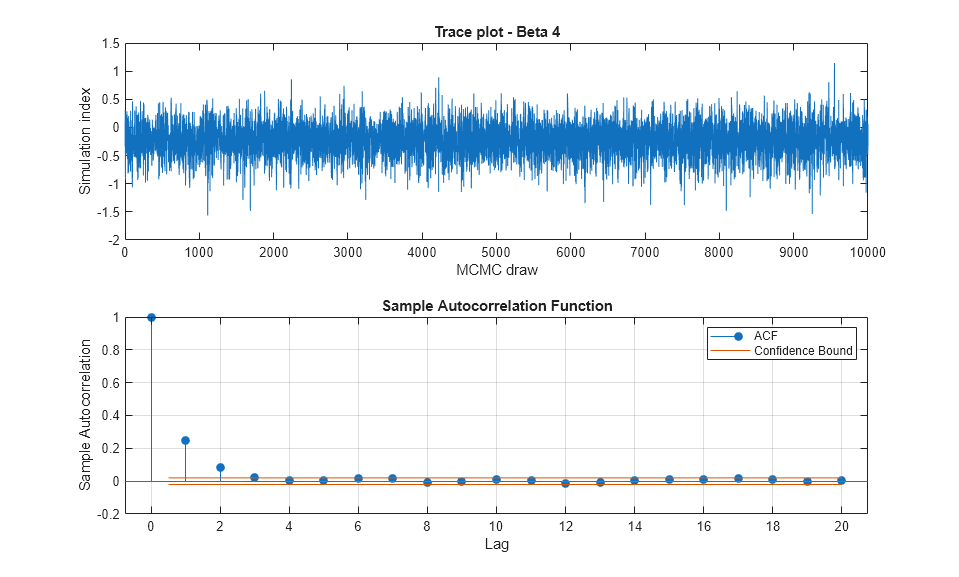 for j = 1:4 figure; subplot(2,1,1) plot(PosteriorMdl.BetaDraws(j,:)); title(sprintf('Trace plot - Beta %d',j)); xlabel('MCMC draw') ylabel('Simulation index') subplot(2,1,2) autocorr(PosteriorMdl.BetaDraws(j,:)) end figure; subplot(2,1,1) plot(PosteriorMdl.Sigma2Draws); title('Trace plot - Disturbance Variance'); xlabel('MCMC draw') ylabel('Simulation index') subplot(2,1,2) autocorr(PosteriorMdl.Sigma2Draws)