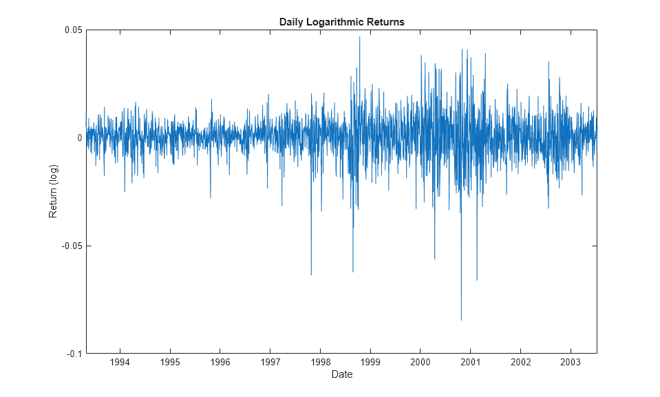 index = 1; % 1 = Canada, 2 = France, 3 = Germany, 4 = Japan, 5 = UK, 6 = US figure plot(dt(2:end), returns(:,index)) xlabel('Date') ylabel('Return (log)') title('Daily Logarithmic Returns')