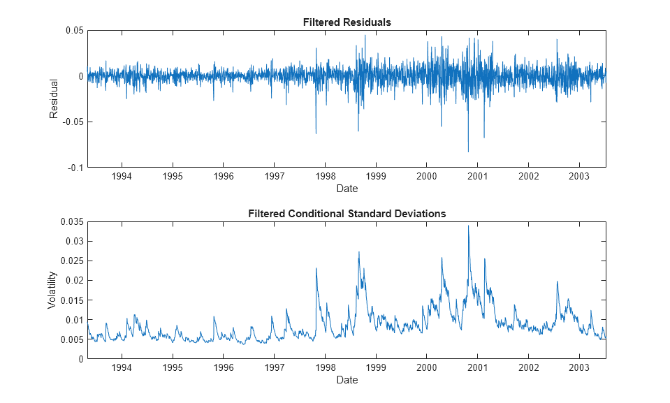 figure subplot(2,1,1) plot(dt(2:end), residuals(:,index)) xlabel('Date') ylabel('Residual') title ('Filtered Residuals') subplot(2,1,2) plot(dt(2:end), sqrt(variances(:,index))) xlabel('Date') ylabel('Volatility') title ('Filtered Conditional Standard Deviations')