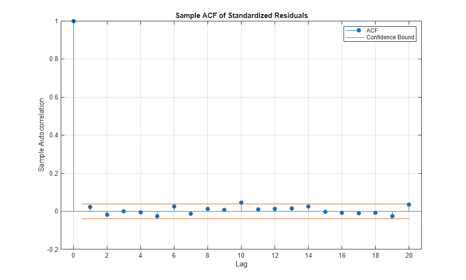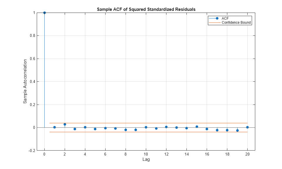 figure autocorr(residuals(:,index)) title('Sample ACF of Standardized Residuals') figure autocorr(residuals(:,index).^2) title('Sample ACF of Squared Standardized Residuals')