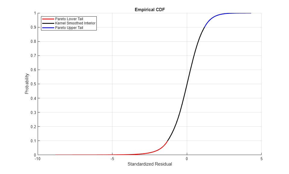 figure hold on grid on minProbability = cdf(tails{index}, (min(residuals(:,index)))); maxProbability = cdf(tails{index}, (max(residuals(:,index)))); pLowerTail = linspace(minProbability , tailFraction , nPoints); % sample lower tail pUpperTail = linspace(1 - tailFraction, maxProbability , nPoints); % sample upper tail pInterior = linspace(tailFraction , 1 - tailFraction, nPoints); % sample interior plot(icdf(tails{index}, pLowerTail), pLowerTail, 'red' , 'LineWidth', 2) plot(icdf(tails{index}, pInterior) , pInterior , 'black', 'LineWidth', 2) plot(icdf(tails{index}, pUpperTail), pUpperTail, 'blue' , 'LineWidth', 2) xlabel('Standardized Residual') ylabel('Probability') title('Empirical CDF') legend({'Pareto Lower Tail' 'Kernel Smoothed Interior' ... 'Pareto Upper Tail'}, 'Location', 'NorthWest')