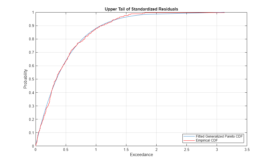 To visually assess the GPD fit, plot the empirical CDF of the upper tail exceedances of the residuals along with the CDF fitted by the GPD. Although only 10% of the standardized residuals is used, the fitted distribution closely follows the exceedance data, so the GPD model seems to be a good choice.