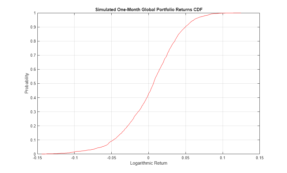 VaR = 100 * quantile(cumulativeReturns, [0.10 0.05 0.01]'); disp(' ') fprintf('Maximum Simulated Loss: %8.4f%s\n' , -100*min(cumulativeReturns), '%') fprintf('Maximum Simulated Gain: %8.4f%s\n\n' , 100*max(cumulativeReturns), '%') fprintf(' Simulated 90%% VaR: %8.4f%s\n' , VaR(1), '%') fprintf(' Simulated 95%% VaR: %8.4f%s\n' , VaR(2), '%') fprintf(' Simulated 99%% VaR: %8.4f%s\n\n', VaR(3), '%') figure h = cdfplot(cumulativeReturns); h.Color = 'Red'; xlabel('Logarithmic Return') ylabel('Probability') title ('Simulated One-Month Global Portfolio Returns CDF')