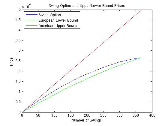 Comparison to lower and upper bounds: Lower bound (European) : 44412.14 Swing Option Price : 60757.33 Upper bound (American) : 68181.42