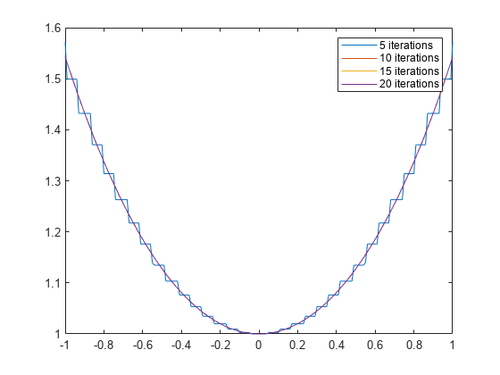 Compute the hyperbolic cosine of a double using a CORDIC-based approximation and specify the number of iterations the CORDIC kernel should perform. Plot the CORDIC approximation of the hyperbolic cosine with varying numbers of iterations.