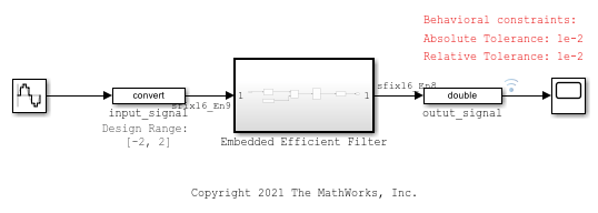 Known design minimum and maximum values are specified explicitly on blocks in the model, including on the inputs and outputs of the Embedded Efficient Filter subsystem.