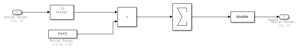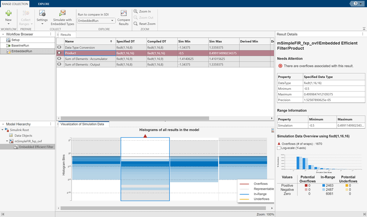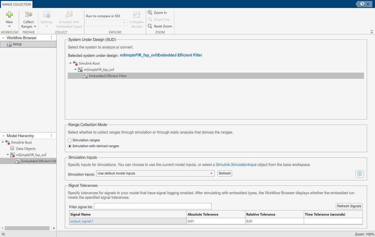 This example shows how to use the Range Collection workflow in the Fixed-Point Tool. The model used in this example is a simple FIR filter modeled using fixed-point data types. In this example, you analyze the numerical behavior of the model to determine the source of overflow in the Embedded Efficient Filter subsystem.