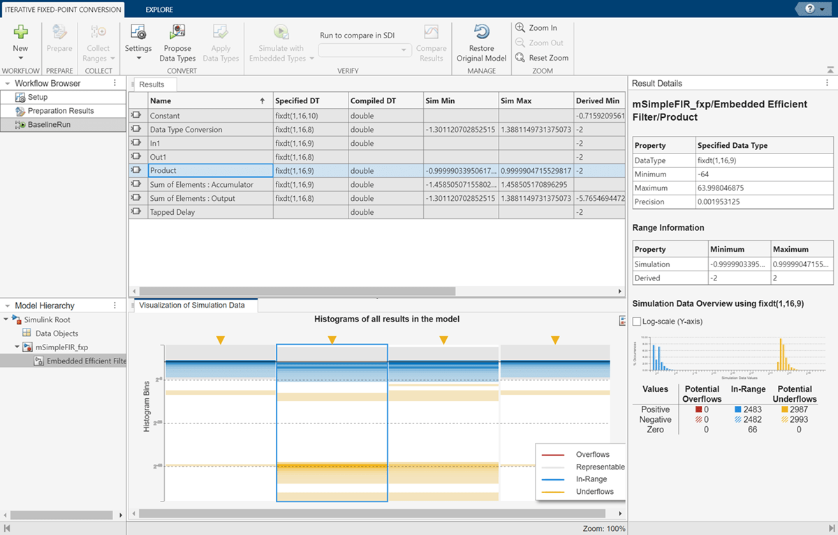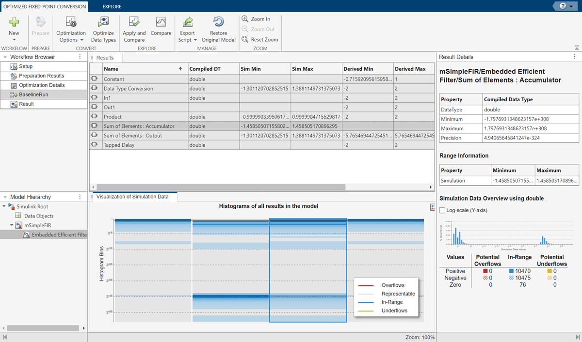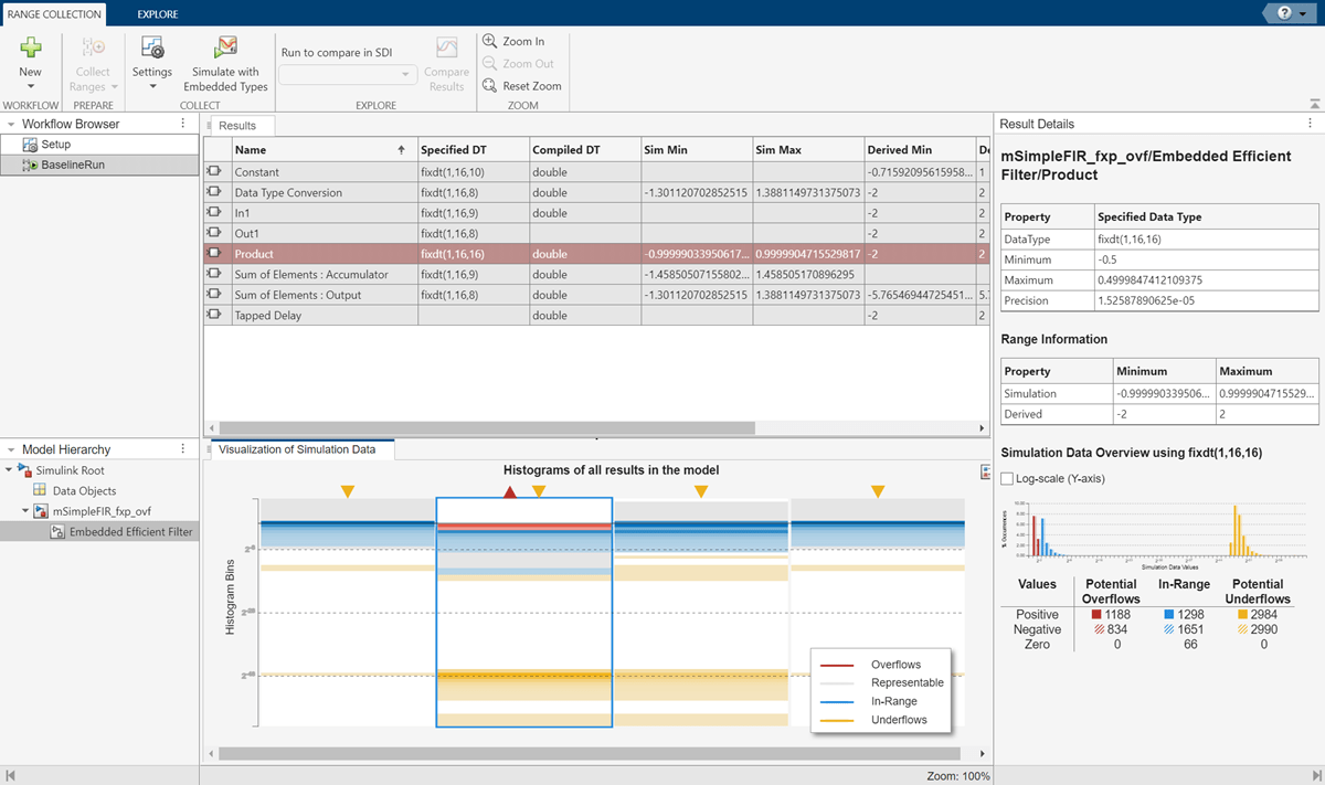 You can click on any result to view additional details in the Result Details pane. The Visualization of Simulation Data pane displays a summary of histograms of the bits used by each object in your model. The simulation data shows that several objects in the model have potential underflows.