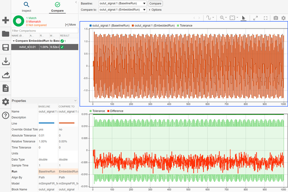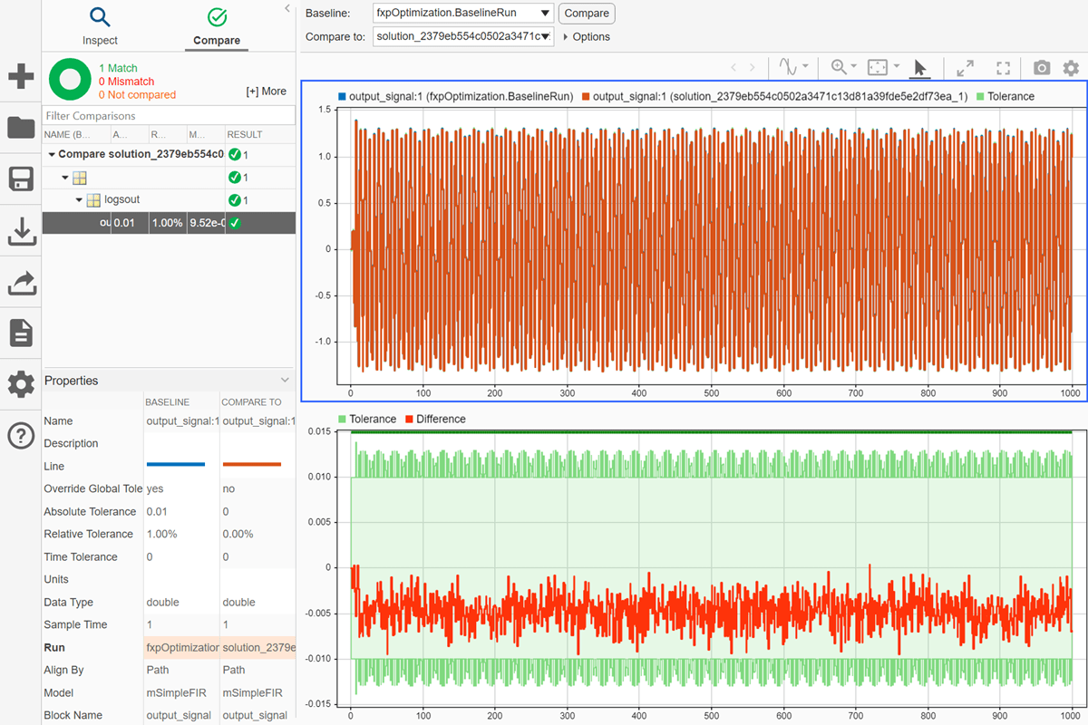 The best solution found during optimization, Solution 1, is automatically applied to the model. To compare this optimized solution to the baseline run, click Compare. In the Embedded Efficient Filter subsystem, you can see the applied optimized fixed-point data types. When you click Compare for a model that has logged signals, the tool opens the Simulation Data Inspector. In the Simulation Data Inspector, select output_signal as the signal to compare. The plot of the plant output signal for Solution 1 is within the specified tolerance band.