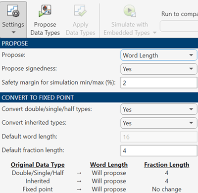 Propose | Whether to propose fraction lengths or word lengths for objects in the system under design.