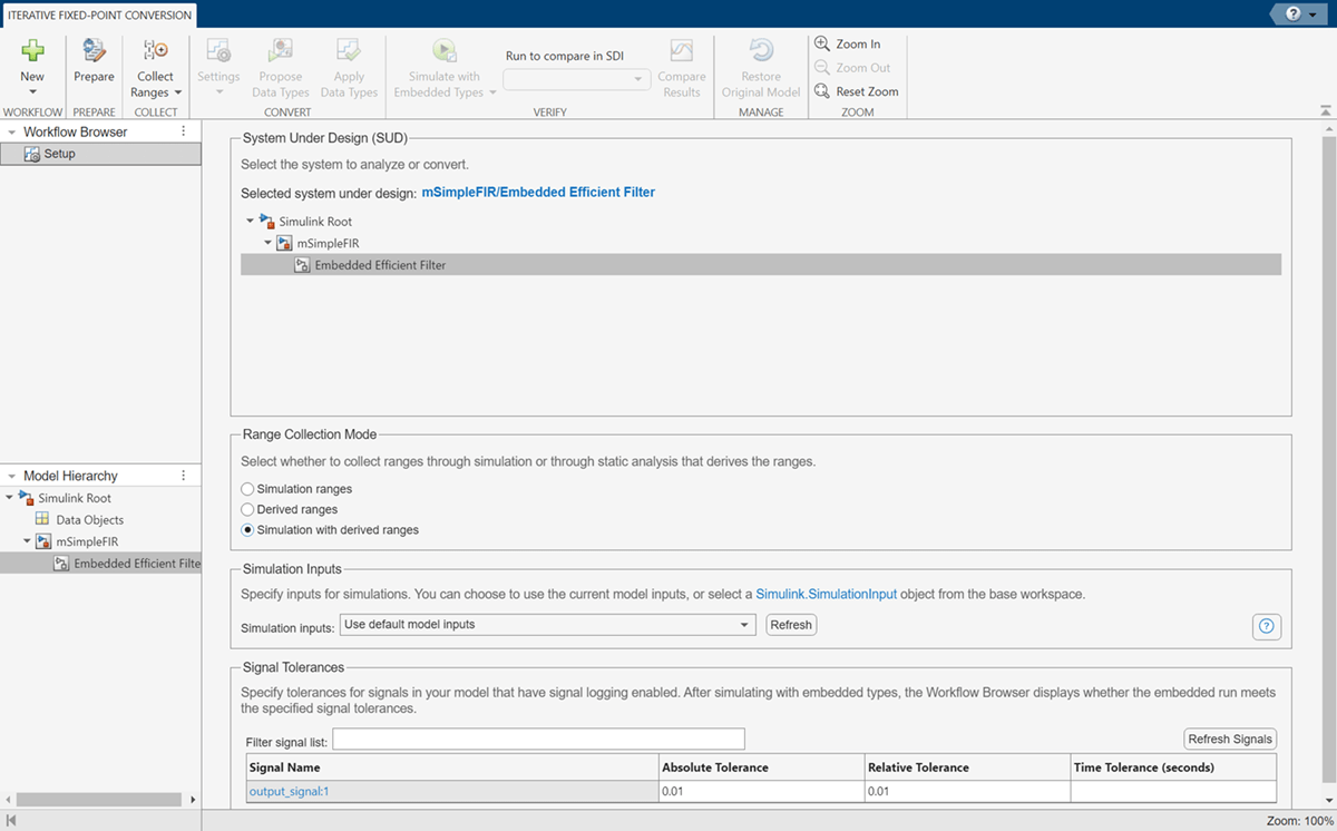 The Optimized Fixed-Point Conversion workflow in the Fixed-Point Tool provides a fully automated means of converting a Simulink® model to fixed point. If you know the desired behavior of your system and can specify acceptable tolerances on this behavior, you can use this workflow to find the optimal data types for your system. You can achieve better results if you additionally specify any known ranges or supply additional simulation inputs.