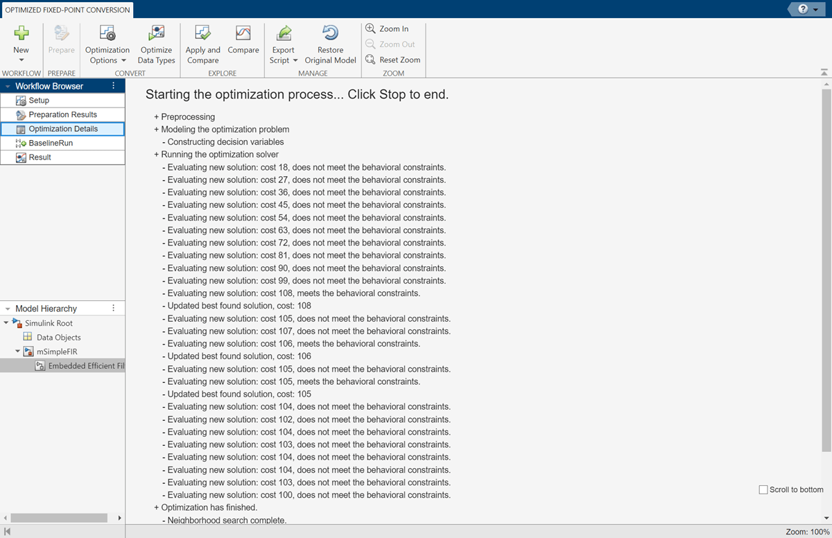 Details about the optimization process are printed to the Optimization Details pane in the Fixed-Point Tool. You can pause or stop the optimization solver before the optimization search is complete by clicking Stop.