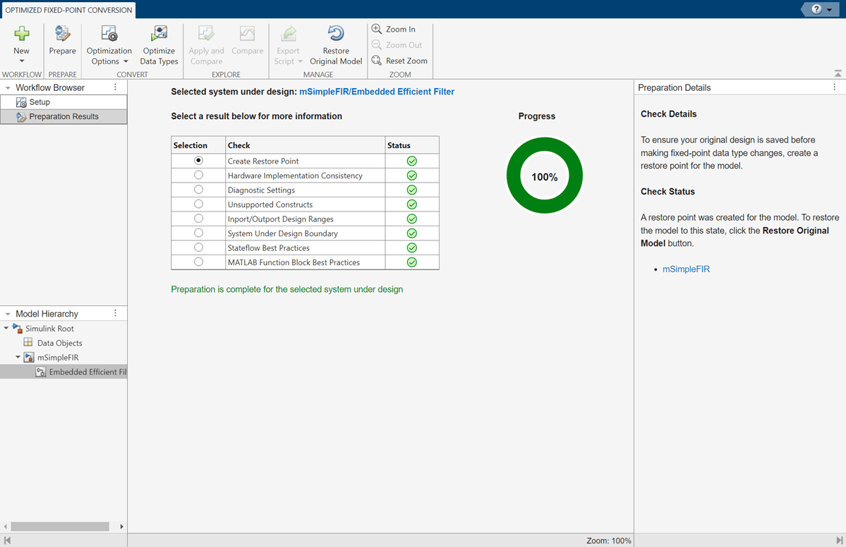 To prepare the model for fixed-point conversion, click Prepare. The Fixed-Point Tool creates a backup version of the model and checks the model for compatibility with the conversion process. For more about preparation checks, see Use the Fixed-Point Tool to Prepare a System for Conversion.