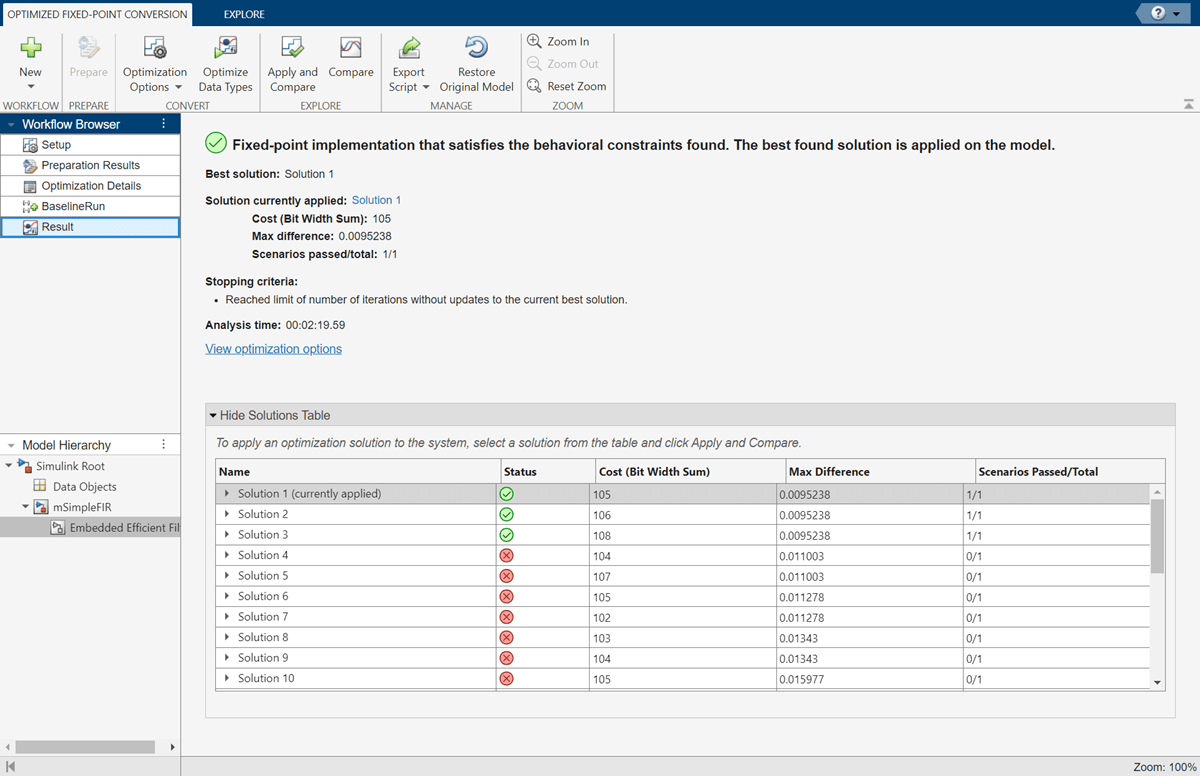 When the optimization is complete, the Fixed-Point Tool displays a table that contains all of the solutions found during the optimization process. Solution 1 in the table corresponds to the best solution found.