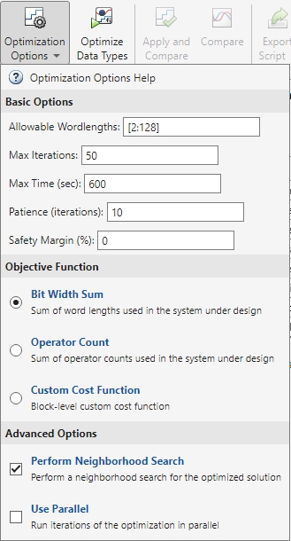 During the optimization process, the software analyzes ranges of objects in your system under design. Optimization will take into account all specified behavioral constraints, including design minimum and maximum values and signal tolerances, to apply heterogeneous data types to your system while minimizing the objective function. For this example, the objective function is set to the default Bit Width Sum, which instructs the optimization to minimize the sum of word lengths in the system under design.