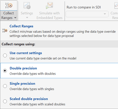 Next, expand the Collect Ranges button arrow to configure the settings to use for range collection. Select Double precision to temporarily override data types in the model with doubles during the baseline range collection run. Click Collect Ranges.