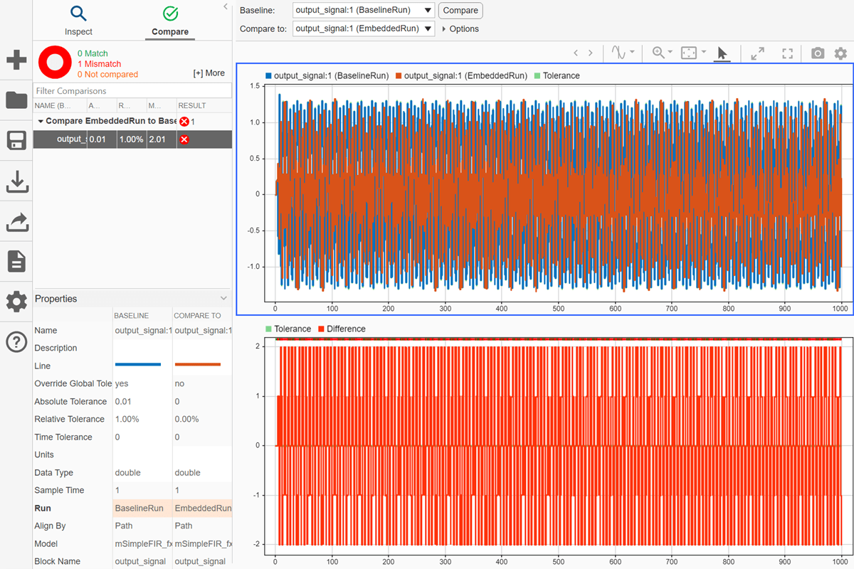 To compare the ideal results stored in BaselineRun with the fixed-point results, select EmbeddedRun from the Run to compare in SDI drop down menu. Then click Compare Results to open the Simulation Data Inspector. In the Simulation Data Inspector, select output_signal as the signal to compare.