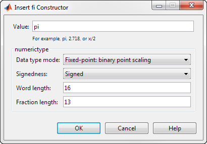 You can build fi object constructors in MATLAB by using the Insert fi Constructor dialog box.