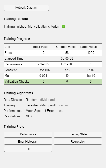 Use the Neural Net Fitting app (nftool) from Deep Learning Toolbox™ to train a neural network to estimate torque and gas emissions of an engine given the fuel rate and speed. Use the following commands to train the neural network.