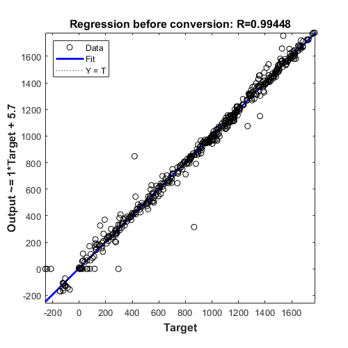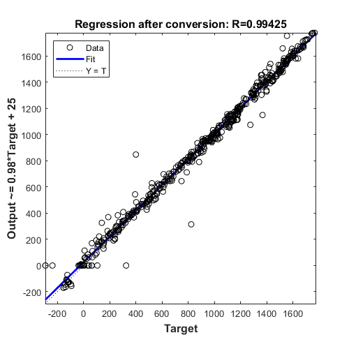 plotRegression(sim_out, baseline_output, system_under_design, 'Regression after conversion');