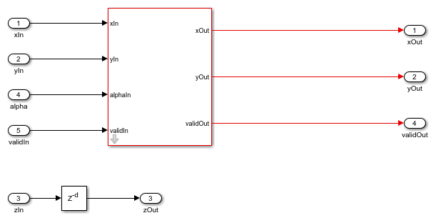 This subsystem illustrates a single planar rotation. The x and y components of the vector, xIn and yIn, are input to the CORDIC Rotation block, along with the angle alpha and validIn. The z component of the vector, zIn, is passed along in a series of registers whose latency matches the latency of the CORDIC rotation.