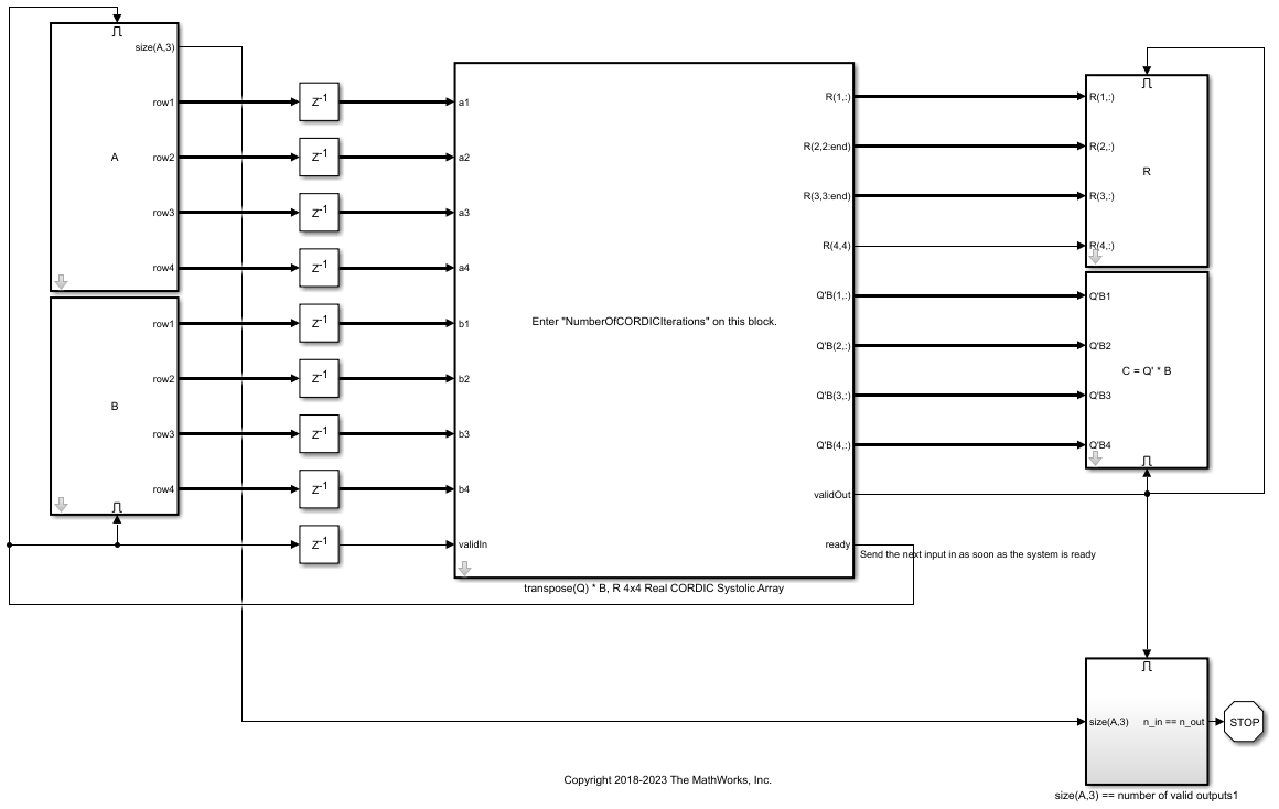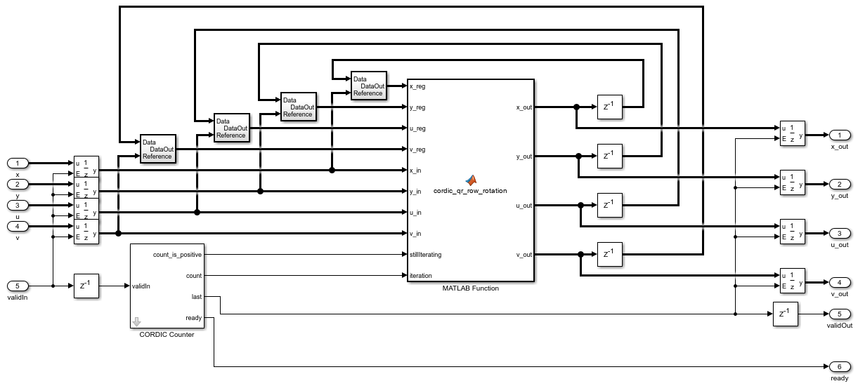 To see the MATLAB code in the MATLAB Function block that performs the Givens transformations using CORDIC, continue to look under the block masks.