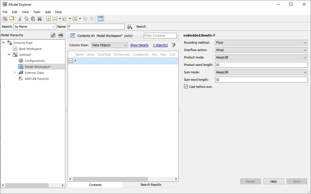 fimathproperties to be associated with all Simulink fixed-point input signals and allfiandfimathobjects constructed within the block.In the Model Hierarchy pane, select Base Workspace. You can see the variable