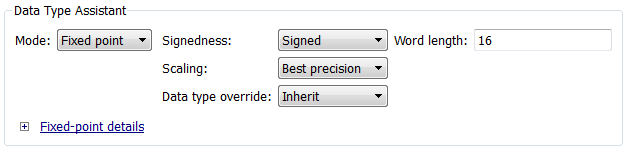 The Data Type Assistant displays additional options associated with fixed-point data types.