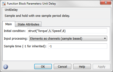 Double-click the Unit Delay block to view the block parameters. The Unit Delay block uses a structure initial condition.