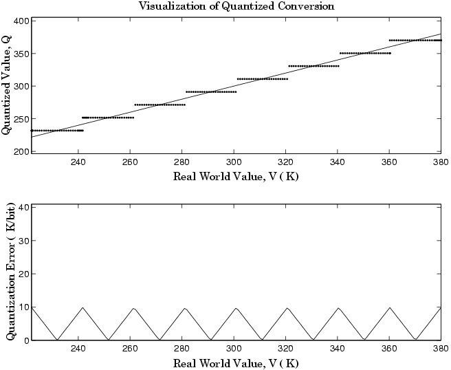The air temperature needs to be quantized for processing by the embedded control system. Assuming an unrealistic quantization to 3-bit unsigned numbers: 0,1,2,...,7, the purely linear conversion with maximum precision is