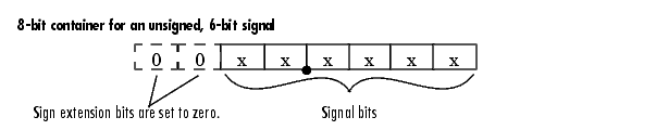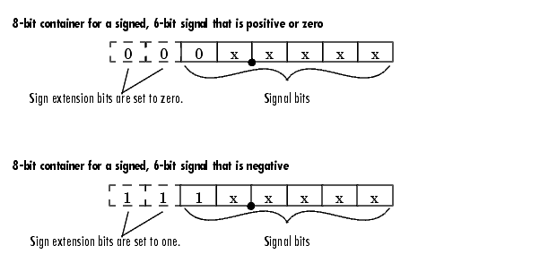 For example, a signal of data type sfix6_En4 is held in a FXP_STORAGE_INT8 container. The signal is held in the six least significant bits. The remaining two bits are set to zero when the signal is positive or zero, and to one when it is negative.