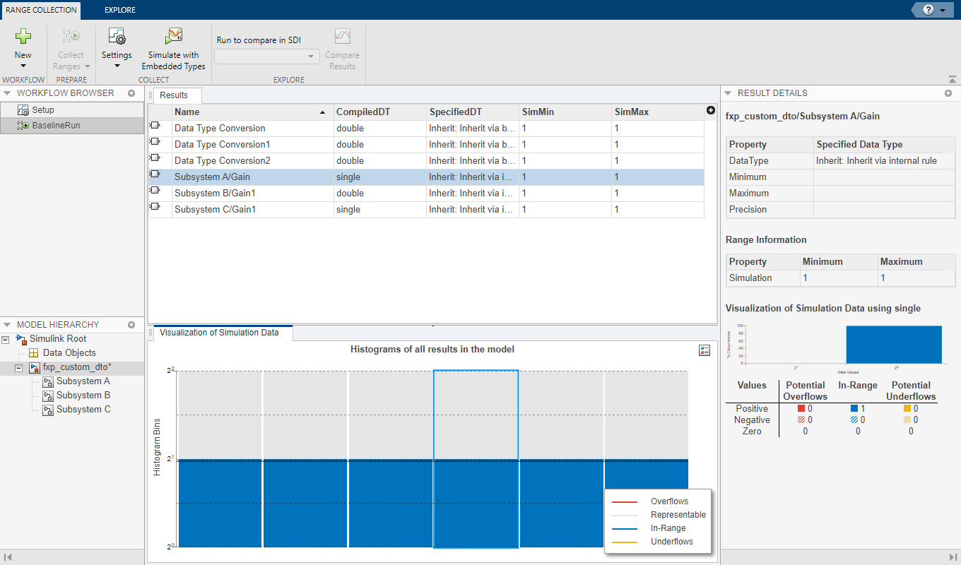 The Fixed-Point Tool collects ranges via simulation using the current data type override applied to your model. In this example, the data types of Subsystem A and Subsystem C are overrode with singles, and Subsystem B remains in double precision.