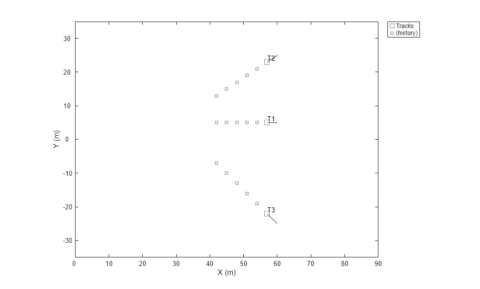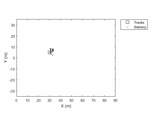 tp = theaterPlot('XLim',[0,90],'YLim',[-35,35]); tPlotter = trackPlotter(tp,'DisplayName','Tracks','HistoryDepth',5);