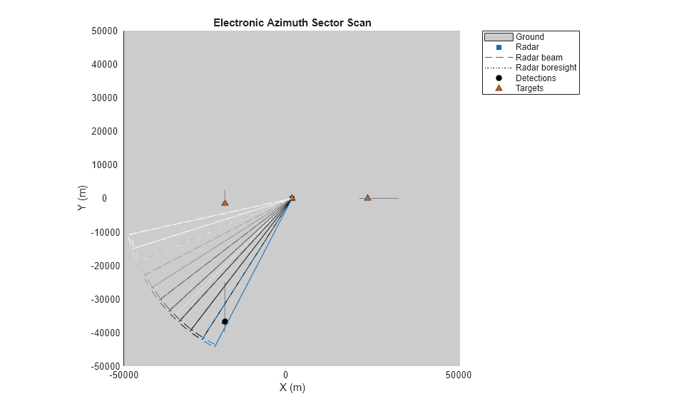 This example shows you how to model different radar scan modes using the fusionRadarSensor. This example shows how to configure the fusionRadarSensor for several commonly used radar scan modes. With this model, you can simulate radars which mechanically scan, electronically scan, and which use both mechanical and electronic scanning. The scan limits in azimuth and elevation are configurable for both mechanical and electronic scan modes.